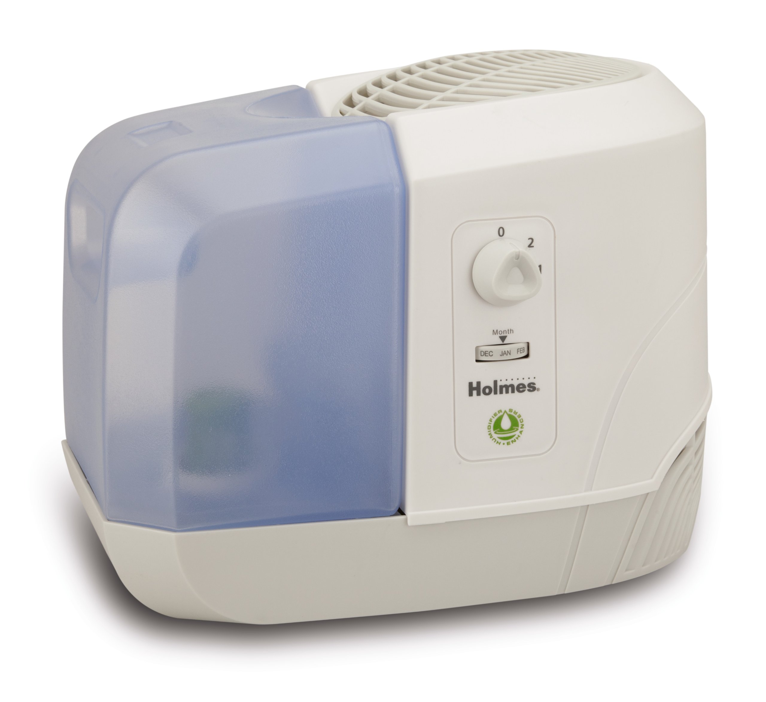 Image: Holmes Cool Mist Humidifier HM1300BF-UM. This image shows the humidifier unit with its clear blue water tank and white base, highlighting its compact design and key features like the control dial and filter information.