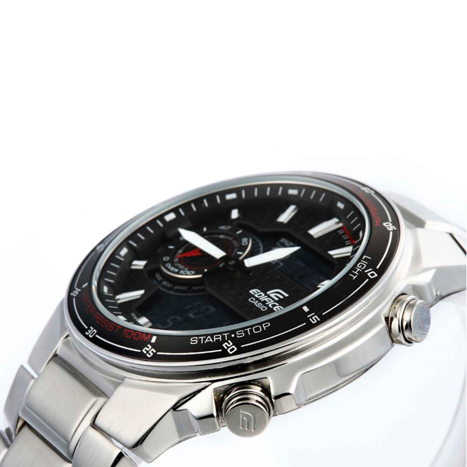 The Casio Edifice EFA-131D-1A1VDF features a black dial, stainless steel case, and stainless steel band. It combines analog timekeeping with digital display functions, offering versatility and precision.