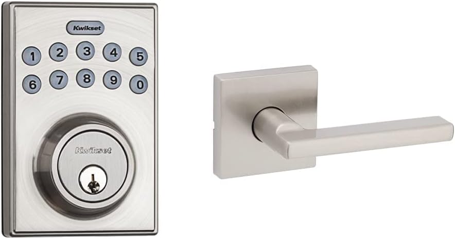 En xeral view of the Kwikset Electronic Keypad Deadbolt and the Halifax Passage Door Handle, both in a Satin Nickel finish.