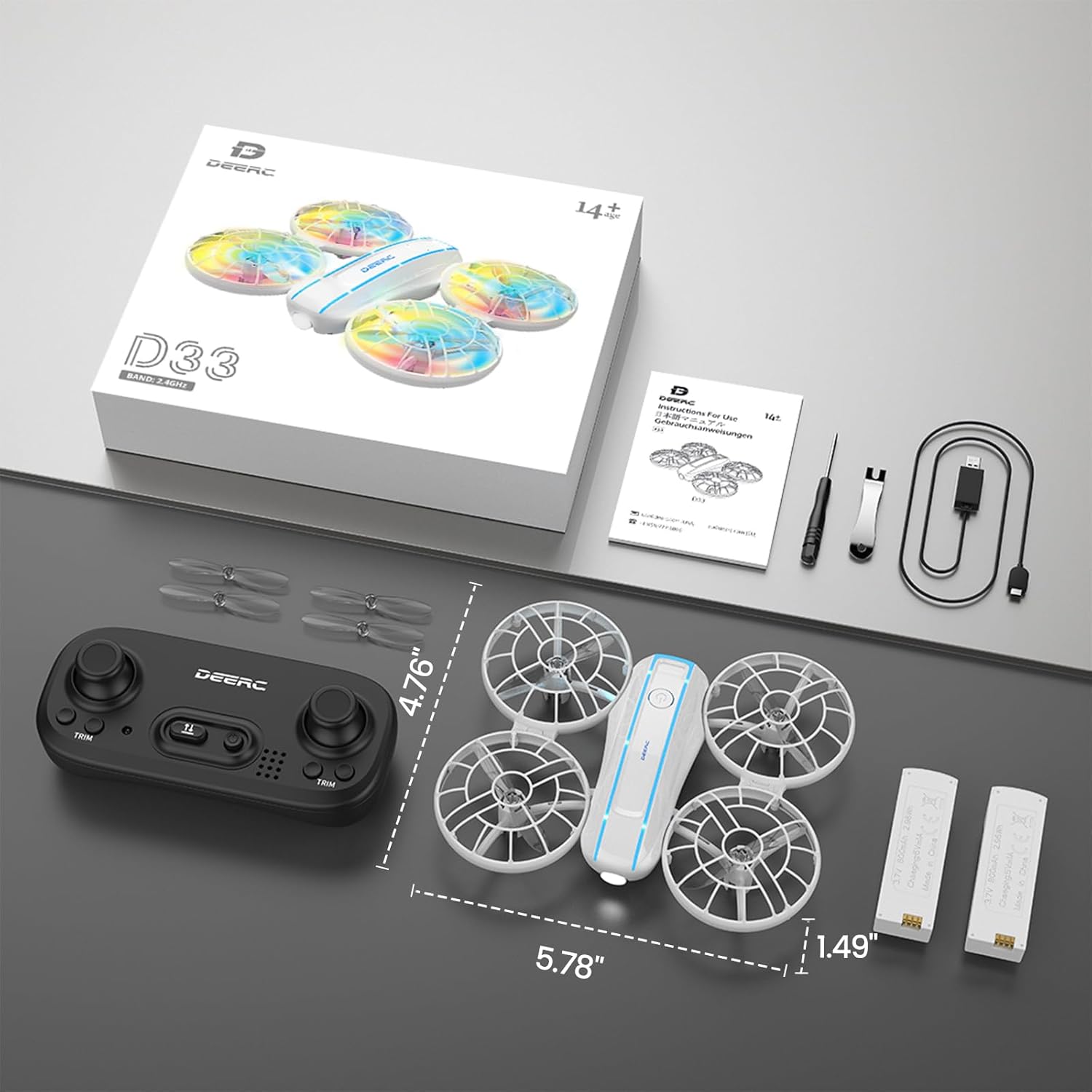 Este manual ofrece instrucións completas para o funcionamento, a configuración e o mantemento seguros do teu minidron DEERC D33. Lea este manual detidamente antes de operar o dron para garantir o seu correcto funcionamento e evitar danos ou lesións. O DEERC D33 está deseñado para uso en interiores e conta con luces LED ultrabrillantes, múltiples modos de voo e controis fáciles de usar, o que o fai axeitado para principiantes e nenos.
