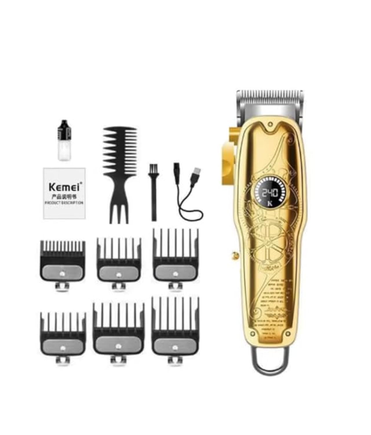 Imaxe 1: Kemei KM-1969 PG Hair Clipper shown with its full set of accessories, including guide combs, cleaning brush, oil, and USB charging cable.