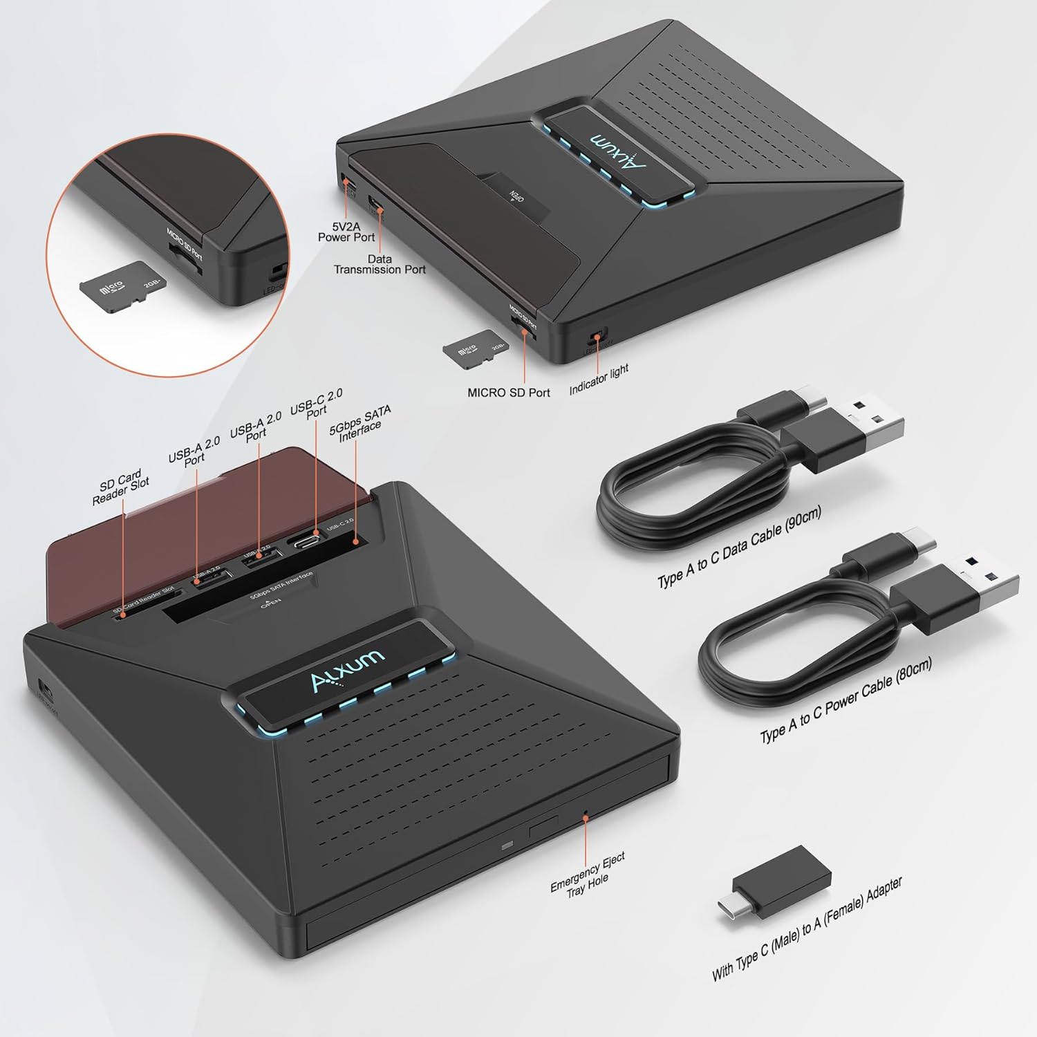 - Funcionalidade 7 en 1: Integrates 3 USB 2.0 ports (2 USB-A, 1 USB-C), SATA 2.5-inch hard drive support, SD card slot, Micro SD card slot, and CD/DVD burning capabilities.